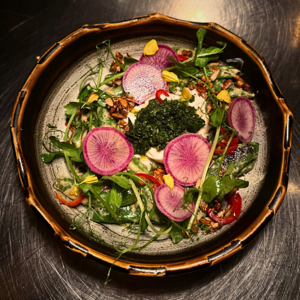 Bright, aromatic, and layered, this single-vineyard Grüner Veltliner delivers lively acidity with notes of savory herbs, pepper, and green fruit. The wine’s cool-climate character pairs beautifully with the garden-fresh mint, crisp snap peas, and creamy burrata.